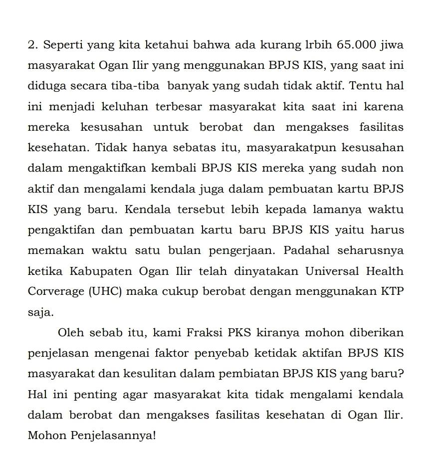 4. Seperti yang kita ketahui bahwa ada kurang lebih 65.000 jiwa masyarakat Ogan Ilir yang menggunakan BPJS KIS, yang saat ini diduga secara tiba-tiba banyak yang sudah tidak aktif. Tentu hal ini menjadi keluhan terbesar masyarakat kita saat ini, karena mereka mengalami kesulitan untuk berobat dan mengakses fasilitas kesehatan. Tidak hanya sebatas itu, masyarakatpun kesusahan dalam mengaktifkan kembali BPJS KIS mereka yang sudah non aktif dan mengalami kendala juga dalam pembuatan kartu BPJS KIS yang baru. Kendala tersebut lebih kepada lamanya waktu pengaktifan dan pembuatan kartu baru BPJS KIS yaitu harus memakan waktu satu bulan pengerjaan. Padahal seharusnya ketika Kabupaten Ogan Ilir telah dinyatakan Universal Health Corverage (UHC) maka cukup berobat dengan menggunakan KTP saja. Oleh sebab itu, kami Fraksi PKS kiranya mohon diberikan