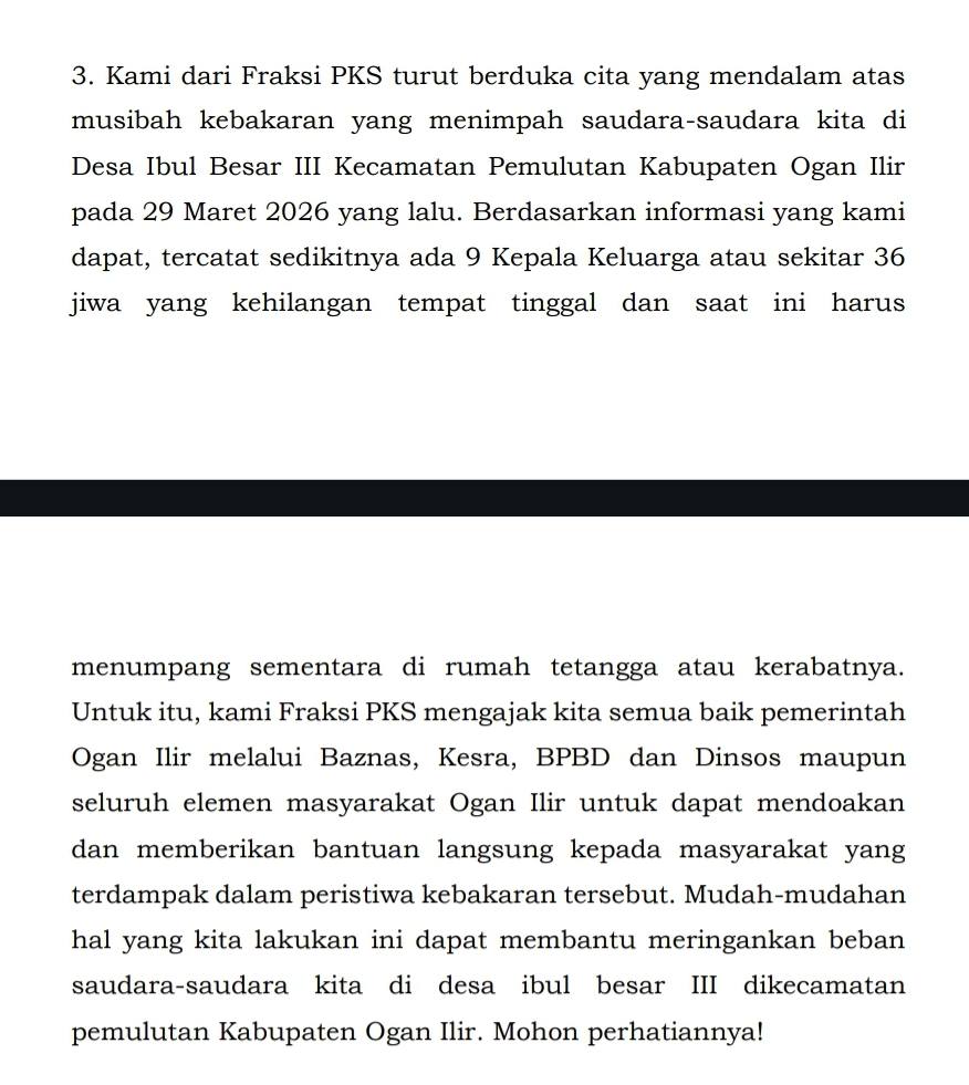 6. Terakhir kita Fraksi PKS menyampaikan rasa turut berduka cita yang mendalam atas musibah kebakaran yang menimpah saudara-saudara kita di Desa Ibul Besar IlI Kecamatan Pemulutan Kabupaten Ogan llir pada 29 Maret 2026 yang lalu. Berdasarkan informasi yang kami dapat, tercatat sedikitnya ada 9 Kepala Keluarga atau sekitar 36 jiwa yang kehilangan tempat tinggal dan saat ini harus menumpang sementara di rumah tetangga atau kerabatnya Untuk itu, kami Fraksi PKS mengajak kita semua baik pemerintah Ogan Ilir melalui Baznas, Kesra, BPBD dan Dinsos maupun seluruh elemen masyarakat Ogan Ilir untuk dapat mendoakan dan memberikan bantuan langsung kepada masyarakat yang terdampak dalam peristiwa kebakaran tersebut. Mudah-mudahan hal yang kita lakukan ini dapat membantu meringankan beban besar saudara-saudara kita di desa ibul dikecamatan pemulutan Kabupaten Ogan Ilir.